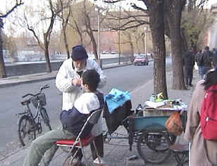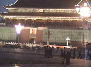 DAY TWO: Beijing Today was a sightseeing day. Jet lag doesn't seem to have killed us too much as we took in quite a bit, but hope to get to bed early tonight because tomorrow is THE BIG DAY -- when we meet our reason for coming here, Shane Fu Horton. After a nice breakfast buffet, we hopped our bus for the day's trip. Wong Li, our tour guide in Beijing, did a great job of explaining all of the amazing things we saw. We started with the Forbidden City. Anyone that has seen the movie "The Last Emperor" (early 90's?) will appreciate what we got to see. Temple after temple plus some interesting gardens and lots of open space within the walls of the city. It was very cold today with a strong wind in most places so we were bundled warmly. Kevin bought a pair of gloves from a street vendor after we realized we only packed one pair. We agreed on 15 yuan (the chinese monetary unit), but when Kevin pulled both Chinese money and American money out of his pocket, the vendor said he would prefer two American dollars for them, so that's what we paid. Speaking of street vendors, they are quite aggressive here. Especially when a group is getting out of a tour bus, we were pretty much ambushed by people selling postcards, books, hats, gloves, etc. -- and they don't seem to know how to take "no" or "boo" for an answer.