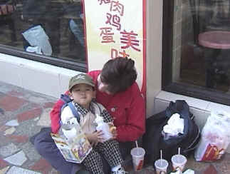 DAY EIGHT: Nanjing Today was our final full day in Nanjing and it was another "lite" day. The weather has been absolutely wonderful though...it has even warmed up here and remained sunny and dry the whole trip so far. The temps are in the 60's or so and we are down to light jacket weather. We only had one quick sightseeing trip today and then back to the hotel and on our own for the rest of the day. We hopped the bus to go visit Xian Wu park, which consists of a very large lake with some islands in the lake that we could go to. Again, probably a lot more beautiful in any of the other 3 seasons, but it was still a nice visit and gave us a chance to get out and stretch other than hiking through busy city streets. Funny thing about Shane, though...even though he is very rambunctious in our hotel room, when we give him the chance to run somewhere, he always wants to be carried. Oh, our achin' backs! We now think one of those aluminum baby carrier backpacks would be a good thing to have, but can't find such things for sale here. An umbrella stroller might help, but there aren't any smooth places where that would work very well, either, so we carry the boy and Dad does a lot of sitting Shane on his shoulders and neck. After that quick trip we hiked the city streets and went to McDonald's for lunch. Shane loved the McNuggets and fries and Mom and Dad -- usually not big on McDonald's -- appreciated the flavor. We walked through a "free market" where we saw lots of live fish, crabs, and plenty of live eels and lots of raw meat available for sale (including a few unidentifiable entrails on the ground). We resisted the urge to buy. After an afternoon nap, Jocelyn had a paperwork appointment where all the families got together to go over and review all the final papers that will be necessary to complete things at the American Consulate offices when we get to Guangzhou. Then we ended the day with a dinner on the top floor of our hotel in Nanjing (24 stories up). It was labeled a "European Restaurant," but we think we threw the restaurant staff for a loop because it took them an incredibly long time to get the meal slowly delivered from the kitchen and they seemed quite unorganized. Example: After dessert was served, they THEN brought out green salads with dressing, following by little fruit plates. In the end, we all were fed, and laughed a lot, even though Shane and some of the babies were getting a bit cranky due to how late it had gotten. Tomorrow, it's off to South China... SPECIAL FEATURE ALERT!!! Click here to download a WAV file where you can hear our Shane's wonderful little voice! Today's Photo Journal:
